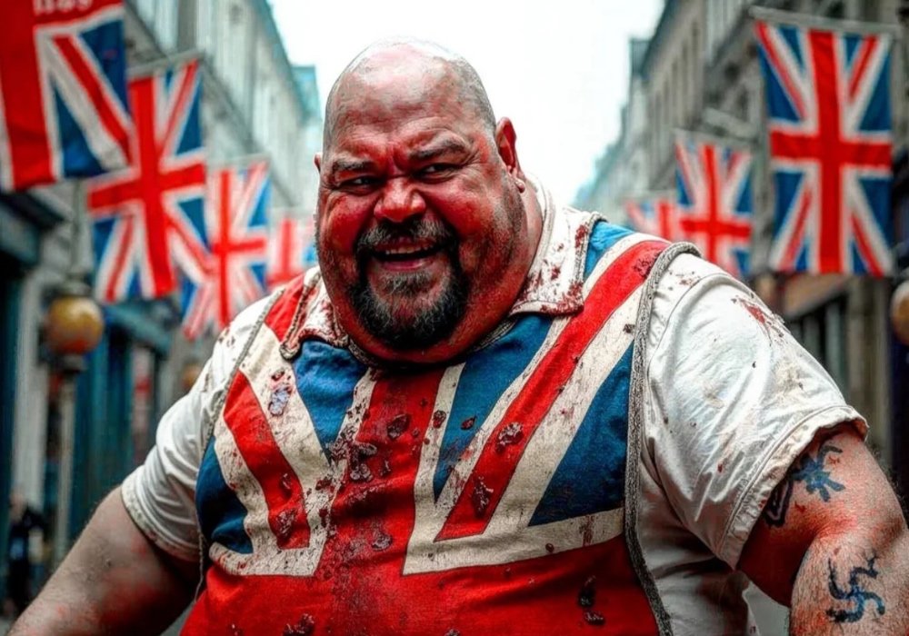 And now, in the present day, how heart-warming to see that grand old apron still paraded by patriots of vision — under the stirring banner of “Raise the Colours”, a noble crusade backed by that philosopher-king of Luton, Tommy Robinson, and the dazzling intellects of Paul Golding of Britain First. Truly, nothing honours the memory of Delhi, Amritsar, Croke Park, Batang Kali, and countless other triumphs quite like re-draping the butcher’s apron and pretending the stains are something other than what they are. Progress, it seems, never goes out of fashion.