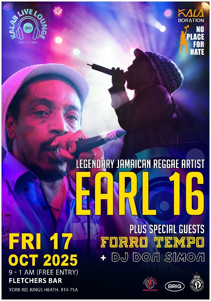 From Kingston to Kings Heath, the vibes are set to soar as the legendary Jamaican reggae artist Earl 16 takes centre stage. With a career spanning more than five decades, Earl 16 has worked with icons including Joe Gibbs, Lee “Scratch” Perry, Augustus Pablo, Mad Professor, and the Friendly Fire Band. His soulful voice and timeless anthems have carried roots reggae, lovers rock, and dub across the world. Now, you can experience that magic live at Kalab Lounge.