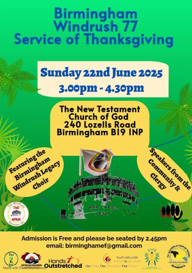 The Birmingham ‘Windrush 77’ Service of Thanksgiving will take place at the New Testament Church of God, 240 Lozells Road, Birmingham B19 1NP, at 3:00 pm. Free admission. A reflective and respectful tribute to the contributions and legacy of the Windrush Generation.